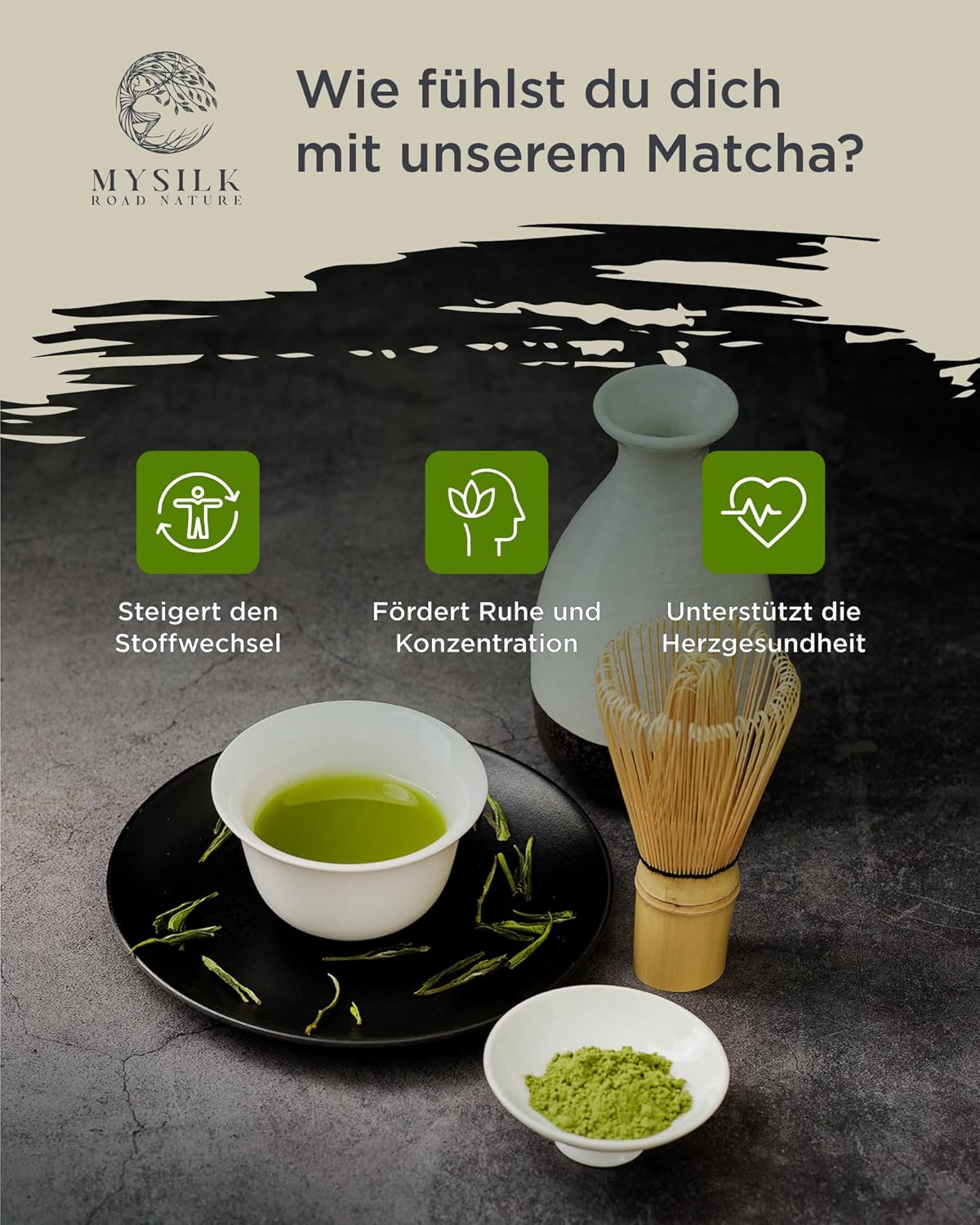 Matcha ist reich an Antioxidantien und Catechinen und enthält natürliches Koffein – ideal für ein Ritual, das dich nicht nur wach macht, sondern klar und ausgeglichen fühlen lässt.