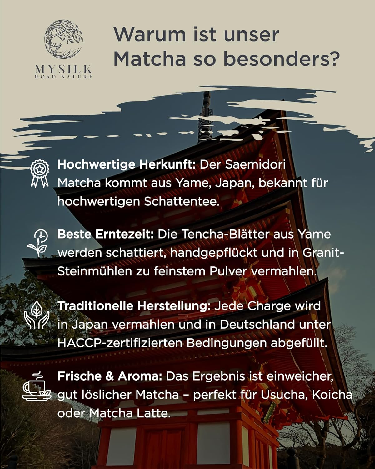 Dieser Matcha ist ein Single Cultivar – hergestellt ausschließlich aus der Varietät Saemidori.